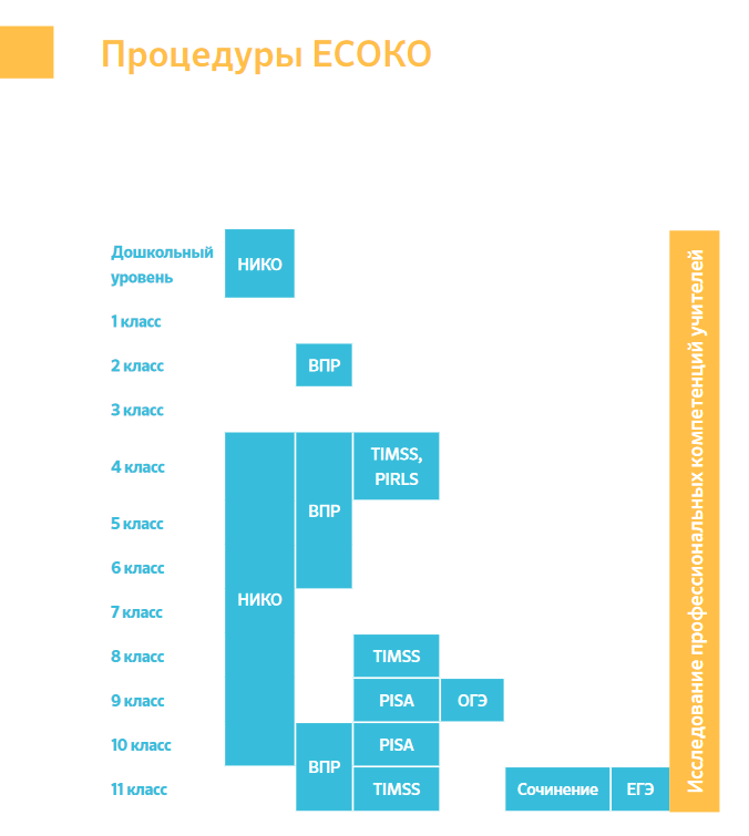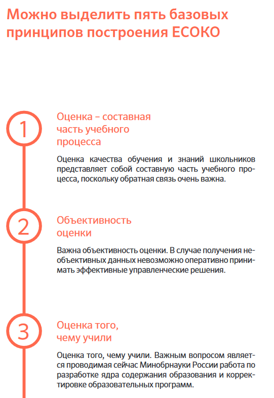 Единая система оценки качества школьного образования в России. В настоящее время в Российской Федерации сформирована единая система оценки качества образования (ЕСОКО), которая позволяет вести мониторинг знаний учащихся на разных ступенях обучения в школе, оперативно выявлять и решать проблемы системы образования в разрезе предметов, школ и регионов.