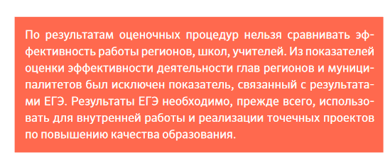 ЕГЭ – инструмент не только оценки знаний, но и повышения качества образования. По результатам ЕГЭ нельзя сравнивать эффективность работы школ и учителей, так как все школы находятся в разных условиях. Эти данные должны использоваться институтами повышения квалификации – очевидно, что результаты оценочных процедур во многом зависят от результатов работы учителей.